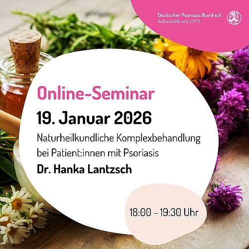 Der Deutsche Psoriasis Bund e.V. (DPB) lädt sehr herzlich zum Online-Seminar "Naturheilkundliche Komplexbehandlung bei Patient:innen mit Psoriasis" mit Dr. Hanka Lantzsch ein.