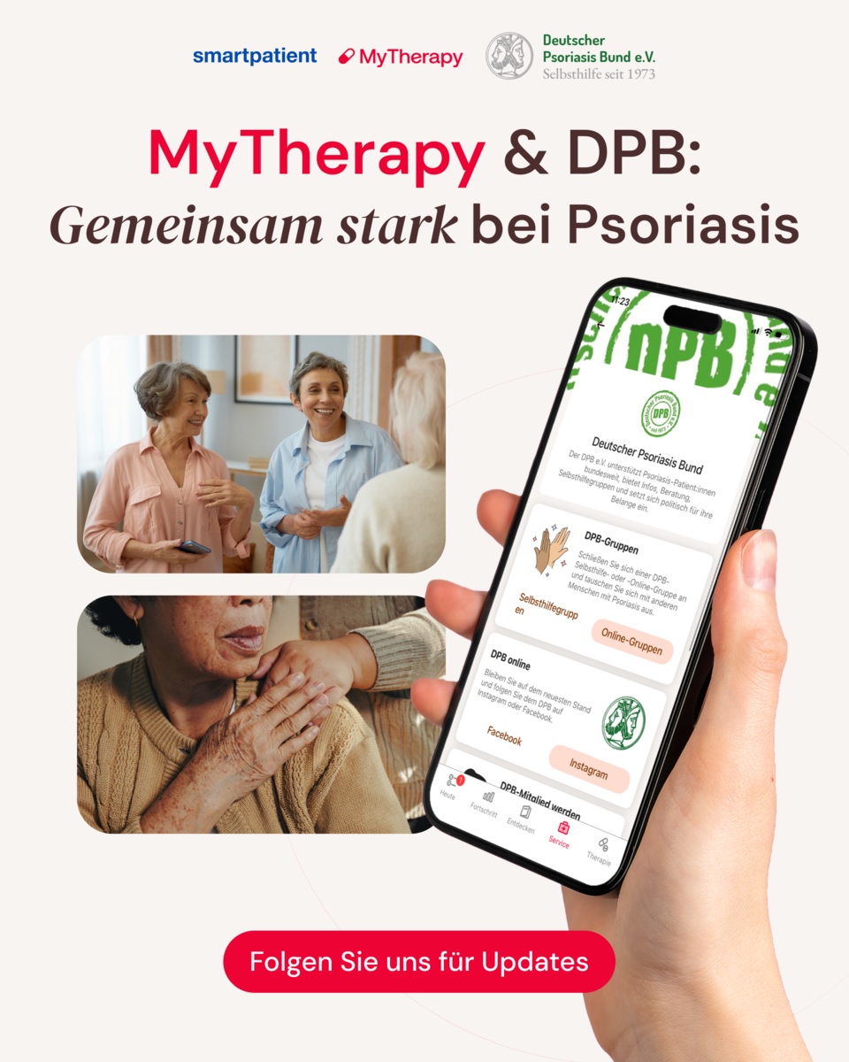 Der Deutsche Psoriasis Bund e.V. ist mit der Smartpatient GmbH eine Kooperation eingegangen. Das Unternehmen aus München hat die App MyTherapy entwickelt. Sie ist kostenfrei und bietet nützliche Funktionen für chronisch kranke Menschen. Dazu gehören unter anderem eine zuverlässige Erinnerung an die Medikamenteneinnahme, die regelmäßige Dokumentation von Symptomen, Stimmung und gesundheitlichen Messwerten, an die man sich ebenfalls erinnern lassen kann, sowie die Möglichkeit, diese Informationen einfach und sicher mit dem Behandlungsteam zu teilen. Weiterhin hat die MyTherapy-App einen Bereich mit patientenfreundlichen Informationen zu bestimmten Erkrankungen.